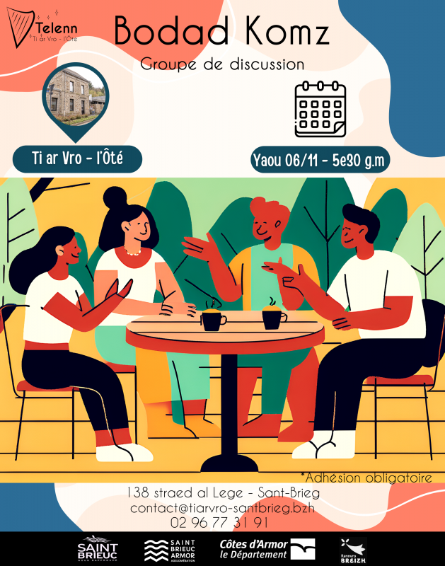 Ar bodad komz a zo o tistreiñ ! Deuit da gemer perzh er bodad komz a-benn kreñvaat ho parregezhioù dre gomz. Ar bodad komz a zo kentoc'h evit brezhonegerien.ezed a zo o teskiñ ar yezh pe evit ar re o deus kudennoù c'hoazh a-benn kaozeal e brezhoneg penn da benn. Emgav d'ar Yaou da 6 a viz Du da 5e30 g.m e Ti ar Vro Sant-Brieg a-benn eskemm e brezhoneg. An holl abadennoù a zo digoust war ar bloavezh a-bezh met ret eo emezellañ da D/Telenn en a-raok.